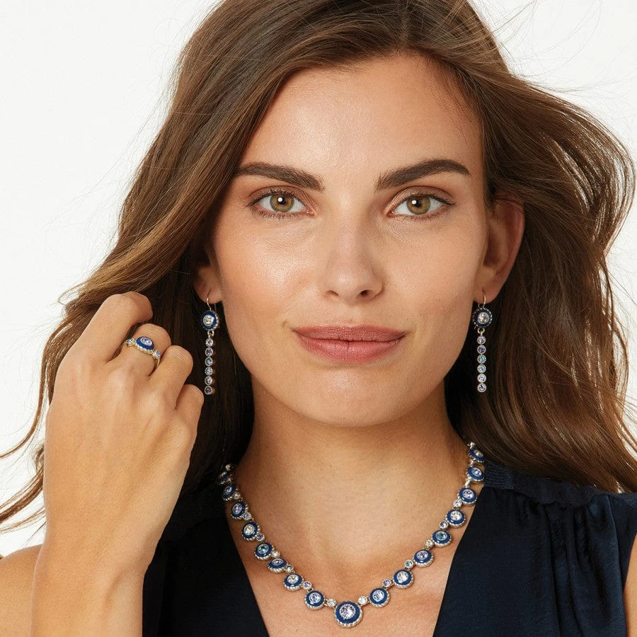 Intensely blue hand-painted enamel encircles a center-stone of fine quality crystal, flanked on either side by twilight hues.