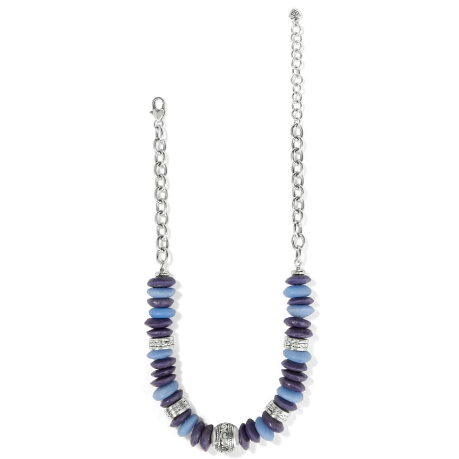 This wear-everywhere statement necklace features a large sphere to match the Mingle Collection, spacer beads with scrolls and hammering and beautiful blue semi-precious and recycled glass beads. It looks stunning with denim, whites, and nearly every other wardrobe color.